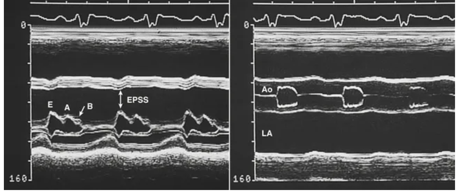 M-mode findings in dilated cardiomyopathy.The mitral M-mode shows increased mitral E-point septal separation (EPSS) and a “B-bump” (left). The aortic M-mode shows decreased aortic root motion with early closure of the aortic valve (right).