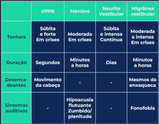 A duração da VPPB é de segundos a a neurite vestibular costuma durar dias.