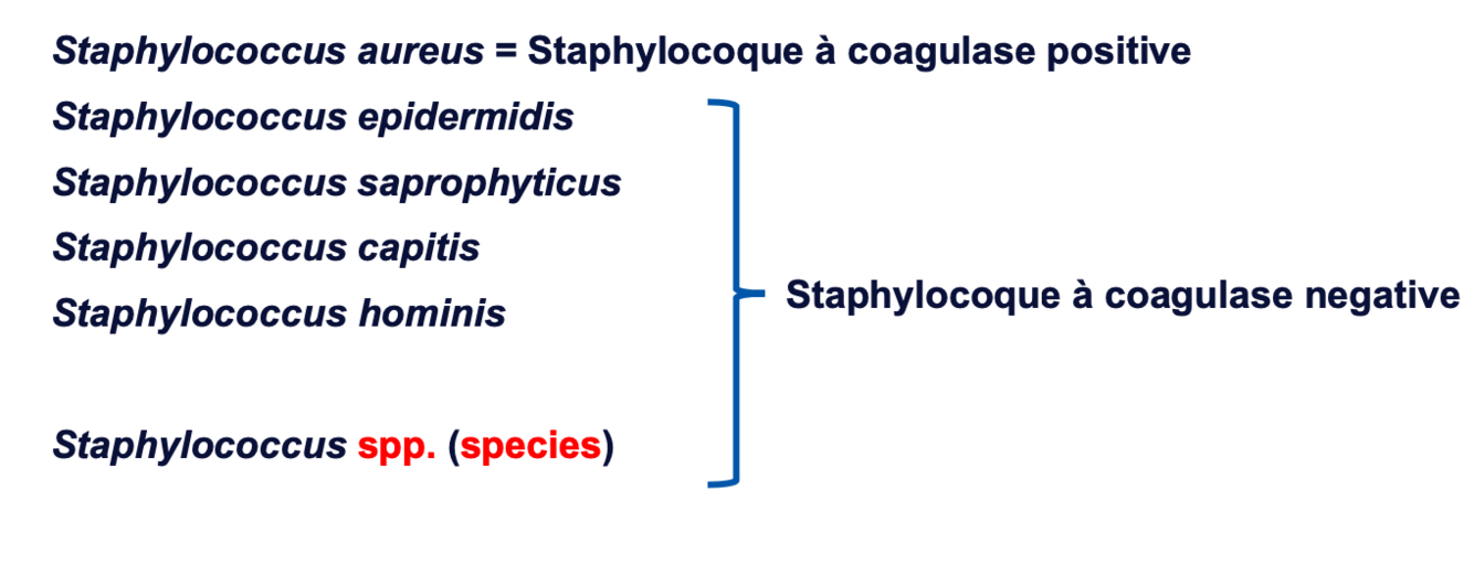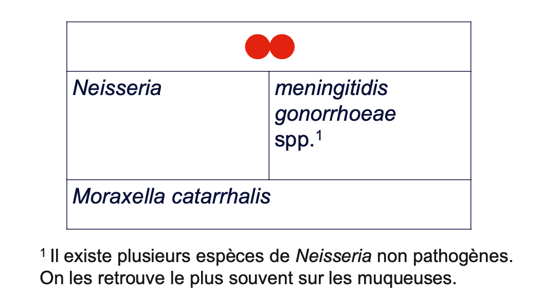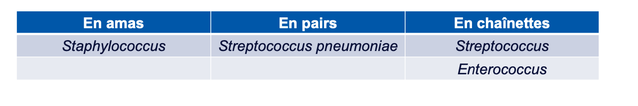 Nommez des cocci gram positif en amas (1), en pairs (1) et en chaînettes (2)