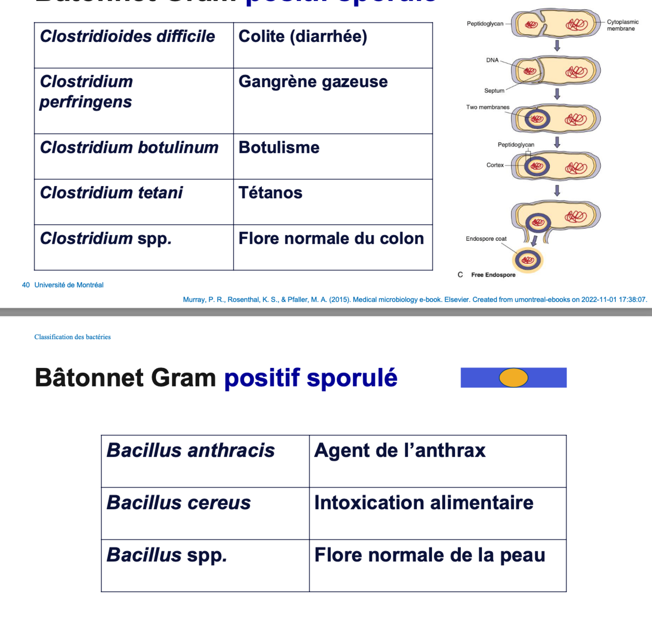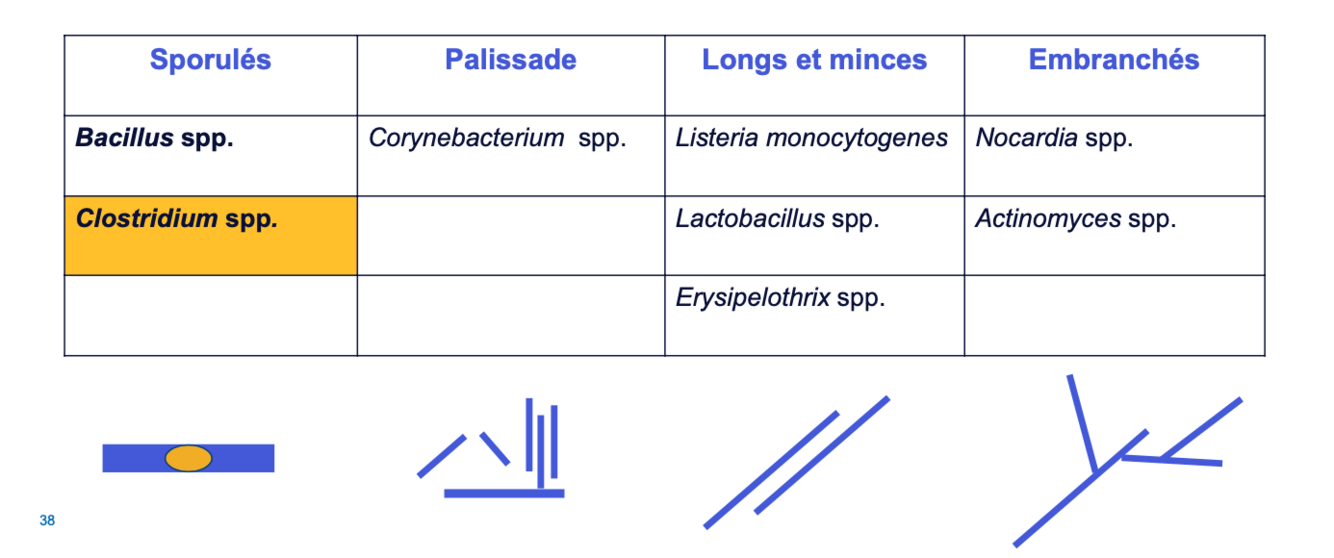 Nommez des bâtonnets gram positif sporulés (2), palissade (1), longs et minces (3) et embranchés (2)