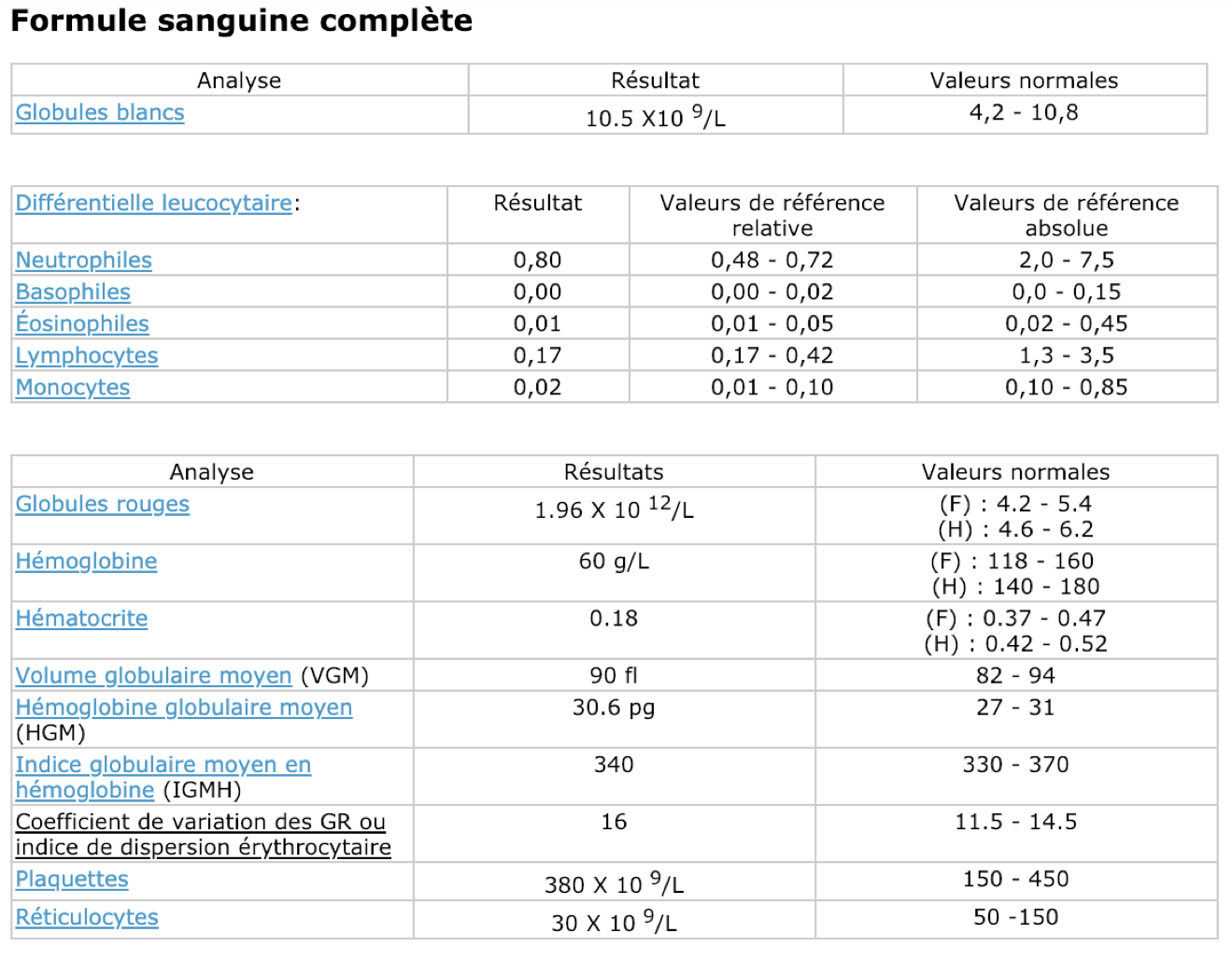 Hémoglobine : 60g/L (N 118-160)