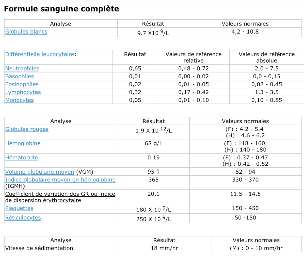 Hémoglobine : 68g/L anémie