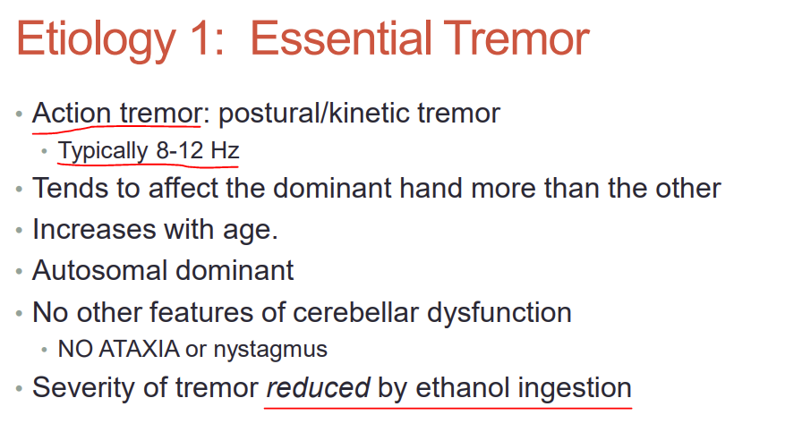 What type of tremor is essential tremor? What Hz is it typically observed at? What effect does ethanol ingestion have on it?
