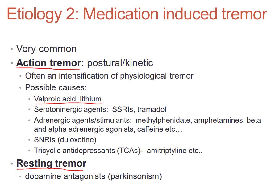 Medication induced tremors can be action or resting tremors. Name two possible medications that could induce action termors, and one that could induce resting tremors.