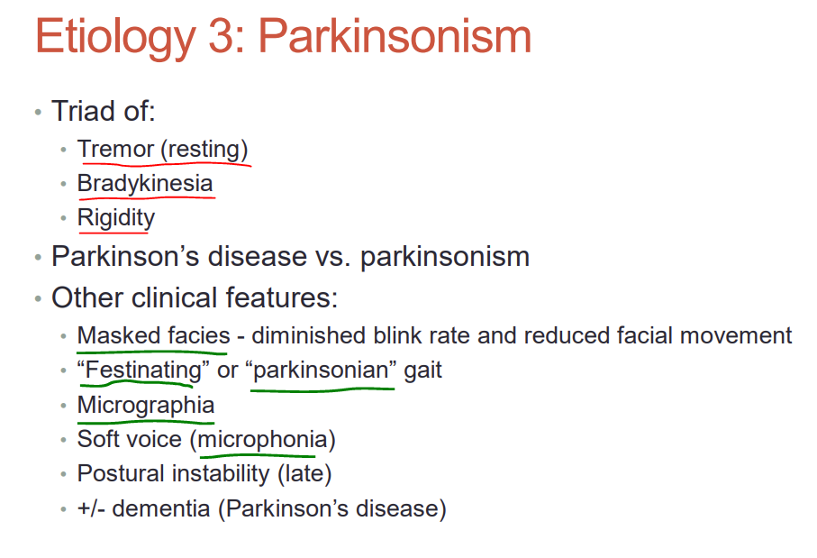 What tremor is associatred with parkinsonism? What are the two other findings in the clinical triad?