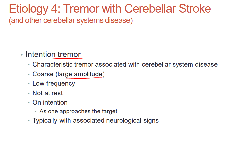 What type of tremor is associated with cerebellar stroke or other cerebellar systems diseases? Is it large or small amplitude?