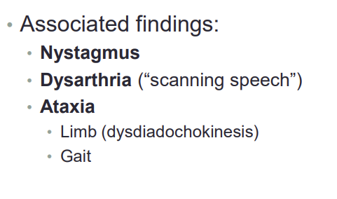 What are three common associated findings with the intention tremor seen in cerebellar insults?