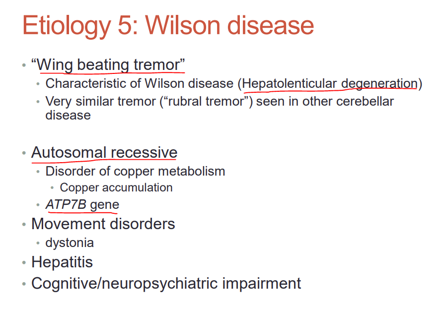 What type of tremor is seen in Wilson disease? What type of degeneration characterizes it? What is the heritance? What gene is affected?