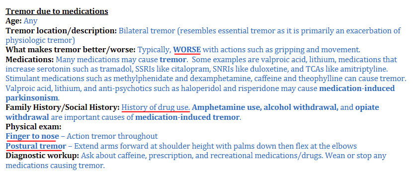 What typically makes a medication induced tremor worse? What notable FH/SH finding may be associated? What are two notable PE findings?