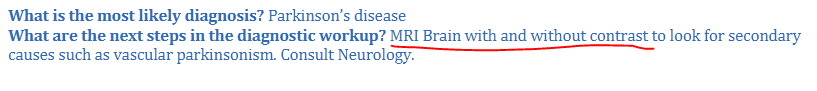 After a suspected diagnosis of parkinsonism due to H&P, what are the next steps in the diagnostic workup?