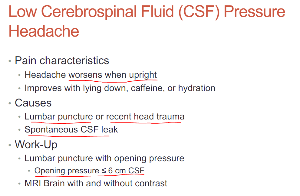 What are the pain characteristics of a low CSF pressure headache? What are two notable causes? What opening pressure is diagnostic?