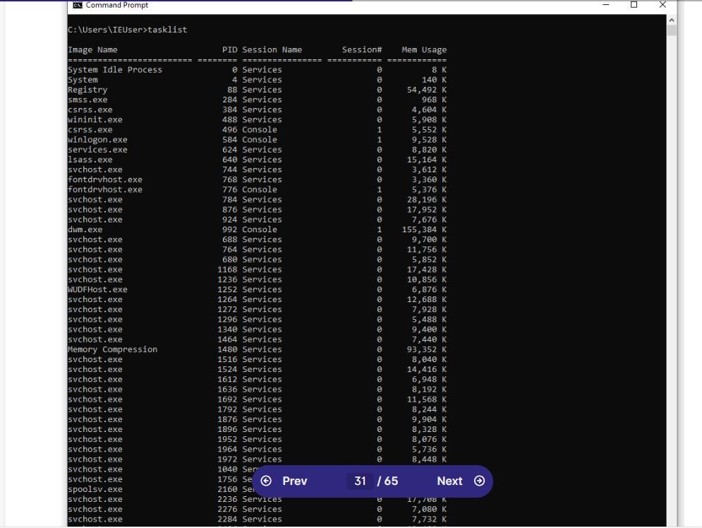 Example: In the below screenshot we are presented with a list of running processes, their process identifiers (PIDs), and the memory usage in the final column. This can be helpful to identify processes that are running in the background and how many system resources they are consuming. This can be a good way to identify malware such as crypto miners which will work silently, but consume a lot of system memory to work.