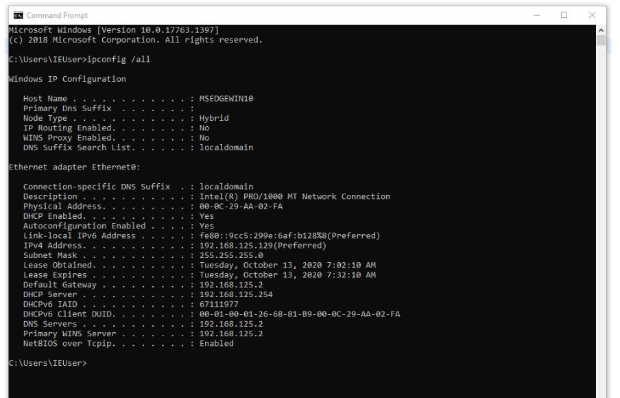 Example: In this example we can see that we have the hostname “MSEDGEWIN10“, a MAC address of “00-0C-29-AA-02-FA“, and IPv4 address of “192.168.125.129” . We can also see that the DNS server being used for name resolution is currently “192.168.125.2“.