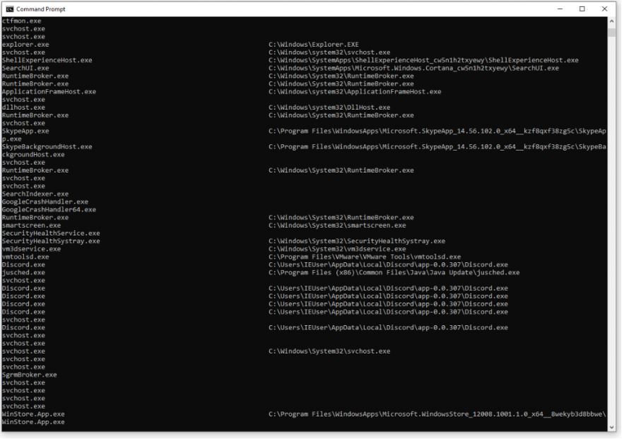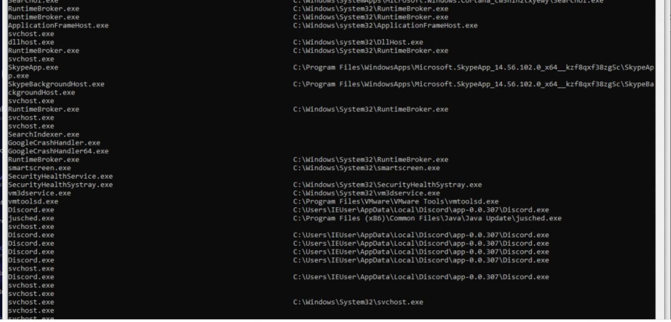 Example: As the description states we are able to view running processes and the executable file that initiated them. Look just below halfway down the list and you’ll find Discord.exe on the left-hand side (process name). To the right on the same row we can see that Discord was launched from C:\Users\IEUser\AppData\Local\Discord\app-0.0.307\Discord.exe – we now have the full file path! We can use this command to identify unusual process names and identify where the executable file is so we can analyze it. Processes that are running out of unusual locations such as /tmp/ and /Downloads/ are definitely worth investigating further!