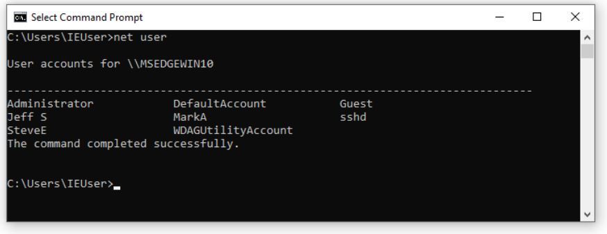 Administrator DefaultAccount Guest Jeff S MarkA sshd SteveE WDAGUtilityAccount