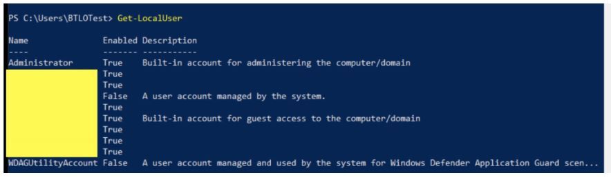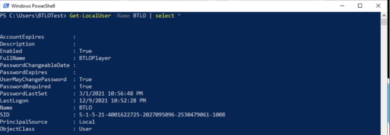 Description: We can provide a specific user to the command to only get information about them. Piping ( | ) the results to a “select” with a wildcard ( * ) will give us all of the properties for the command, providing us with valuable information about the account. This can be extremely useful for us as incident responders, especially when we find local accounts that do not expire or have passwords that don’t expire.