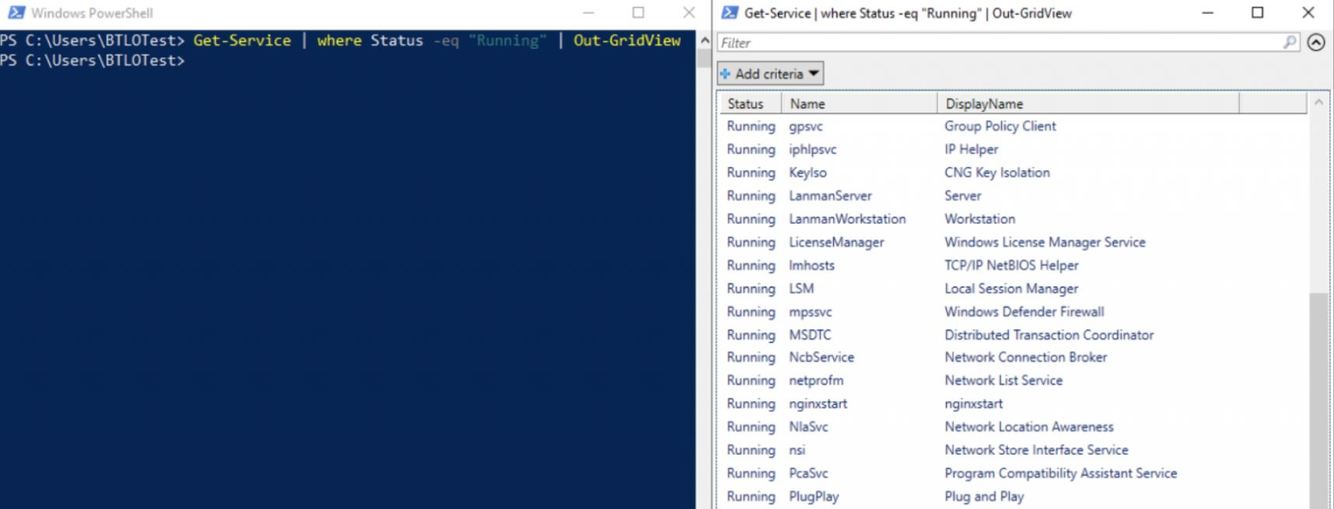 Get-Service | Where Status -eq “Running” | Out-GridView