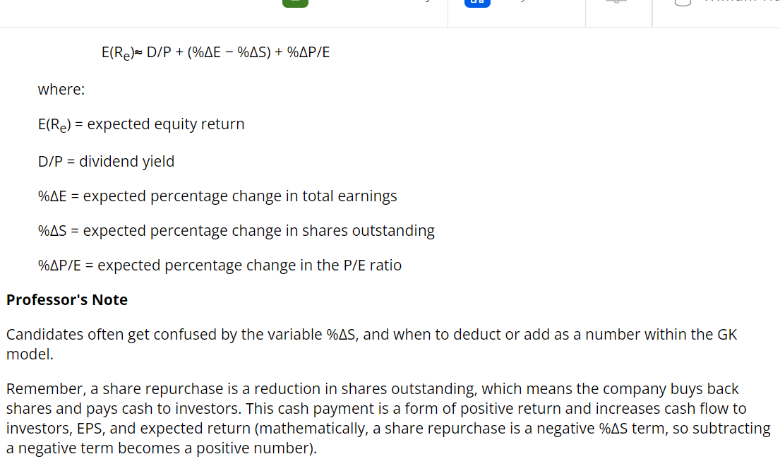 It is helpful to view the Grinold-Kroner model as the sum of the (1) expected cash flow return, (2) expected nominal earnings growth rate, and (3) expected repricing return. this formula is DIFFERENT from the one in the photo –> just rearranged
