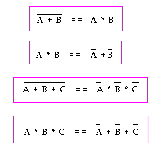 This law states,”NOT (A OR B) is equivalent to NOT A AND NOT B, also NOT (A AND B) is equicalent to NOT A OR NOT B” Ex: A implies B is equal to (A’ v B)