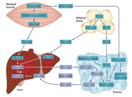 Men vad gör levern med allt glukos den får (även via muskler och fettvävnad)? – jo den skickar glukoset till tumörcellen där de blir till pyruvat. När tumören sedan skickar laktat till levern så sluts en cykel, även kallad för Cori-cykeln.