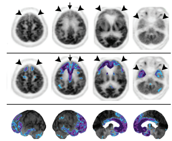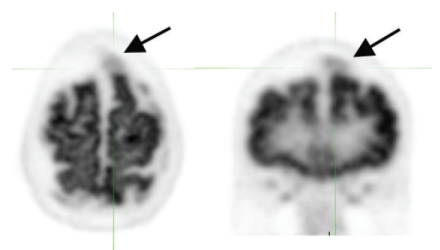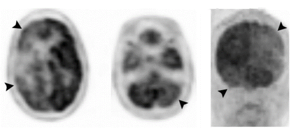 uptake favors the frontal lobe, thalamus, and cerebellum