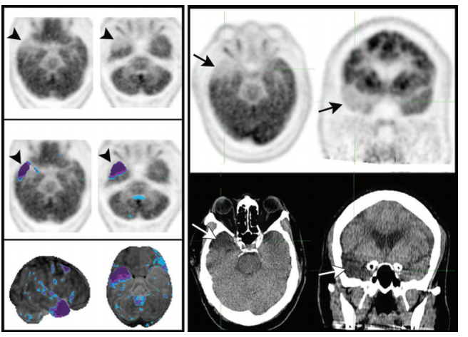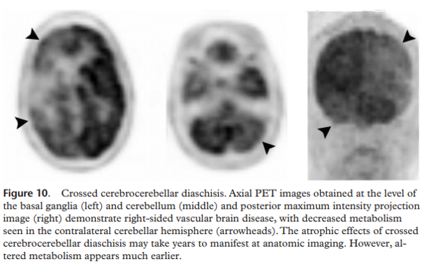 If the frontal lobe or internal capsule is involved, hypometabolism in the contralateral cerebellum may be seen due to crossed cerebrocerebellar diaschisis