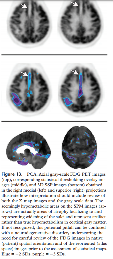 atrophy –> sulcal widening –> artifact of hypometabolism (pitfall for misdiagnosis of neurodegenerative disorder)