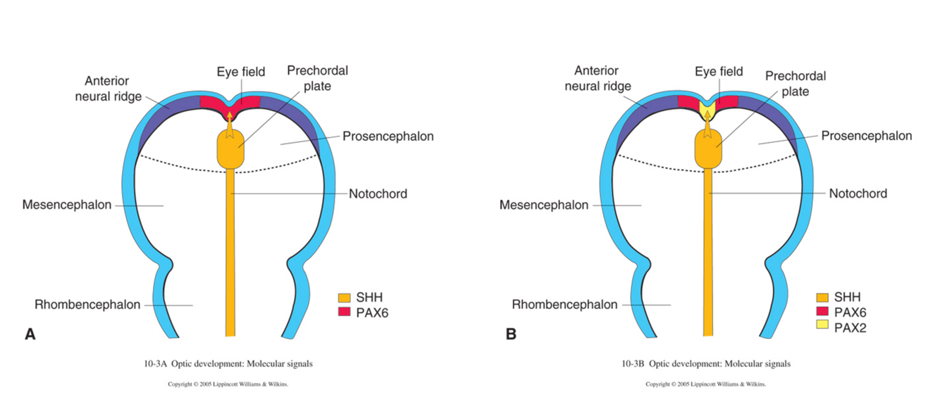 Midline Eye fields are established early in the 3rd week with appearance of the anterior neural ridge in the neural plateSHH expression establishes the midline and separates the eye fields