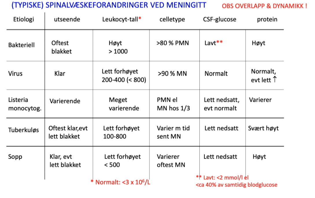 Hva er typiske spinavæskeforandringer v/meningitt?