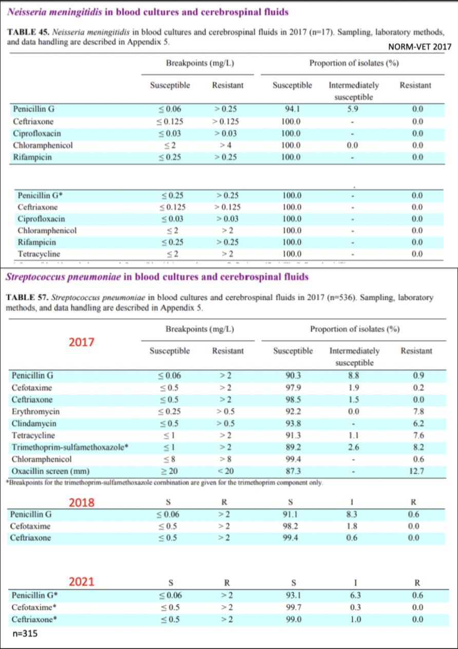 - Forutsatt MIC ≤ 0.06 mg/L; Penicillin G- Hvis cefalosporin MIC > 0.5 mg/L; Cefotaksim + vankomycinH.influenzae: