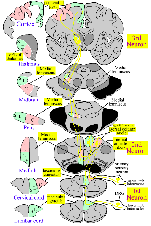 Somatotopy: lower limb info ventral; upper limb info dorsal