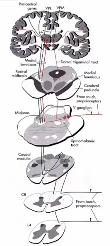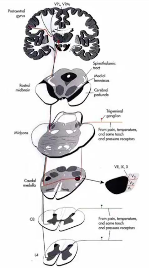 VPL axons terminate in the postcentral gyrus (primary somatosensory cortex)