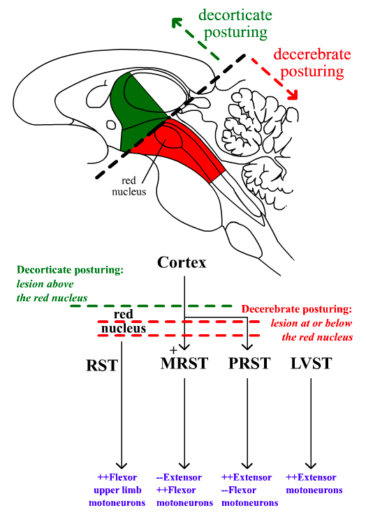 Upper limbs flexed βΎ d/t red nucleus via rubrospinal tract (RST)