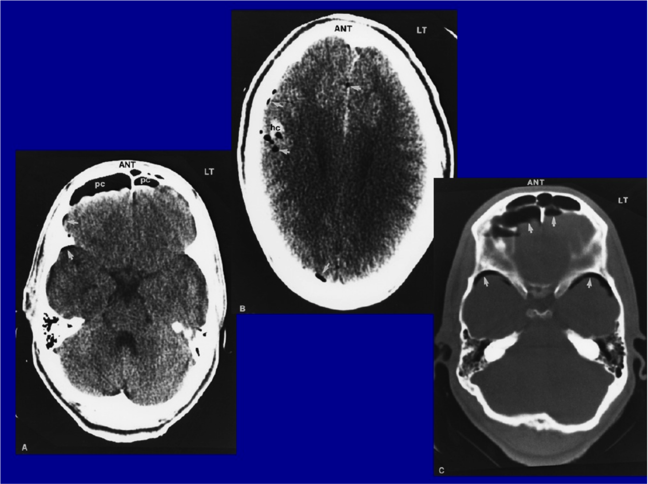 pneumocephalus (probably fracture in sinuses or mastoid where there is air)