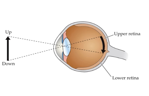 If someone was staning in front of you, the top half of the their body would project to the lower retina; and the bottom half would project to the upper retina