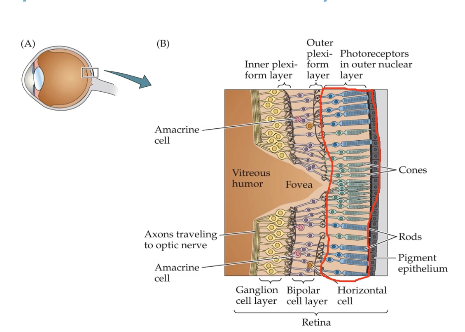 This layer contains our photoreceptors which respond to light and create synapses onto bipolar cells