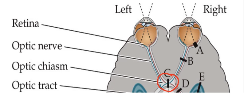 If there was an injury to the Optic Chiasm we would have Bilateral Hemianopsia, AKA Tunnel Vision.