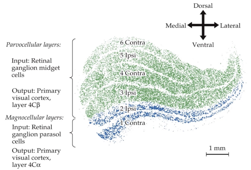 Remember Parasol Cells project to Magnocellular layers; Midget Cells project to Parvocellular layers (these are from the Ganglion Layer of Retina)