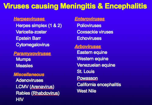 •30% arbovirus (St. Louis, West Nile, La Crosse): Transmitted by mosquitos or ticks and predominantly a disease of children and the elderly