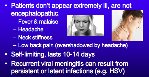 HSV-2 (genital herpes)- look for Mollerat cells in the CSF and tx with acyclovir