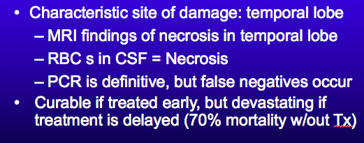 temporal lobe (MRI will show necrosis of the temporal love)