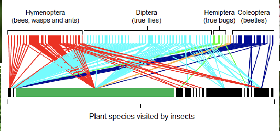 No one to one lines = many plants interact with many insects and insencts interact with many plants