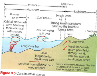 Constructive wave tend occur when wave frequency is low (6 to 8 arriving onshore per minute), especially when these waves advance over a gently shelving sea sea floor formed by fine material such as sand.