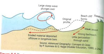 Due to the curving and rapid steepening of the wave breaker, the energy of the wave is transmitted down the beach (on breaker collapse), accelerated by the steeper gradient, and so the wave becomes destructive, breaking down beach material.