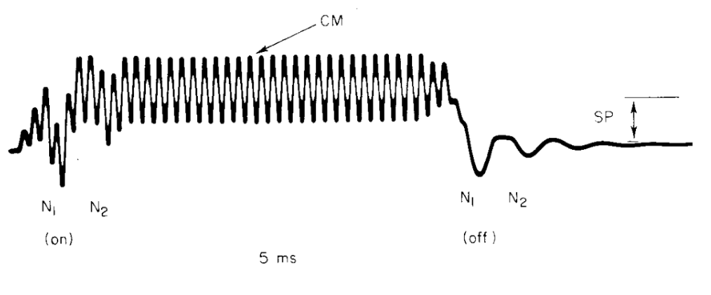 The stereocilia deflection leads to the receptor potential of the hair cell and the CM reflects this.