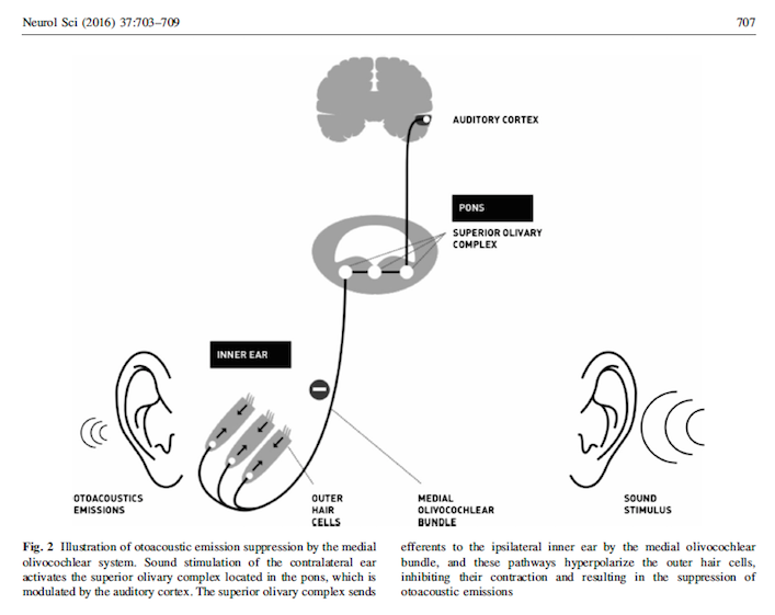 Presenting sound to the contralateral ear means that the OAE can be suppressed and theoretically should be able to evaluate the integrity of the brainstem (ie.is there an issue in that level)