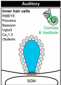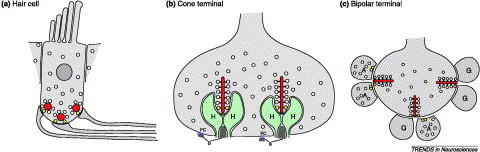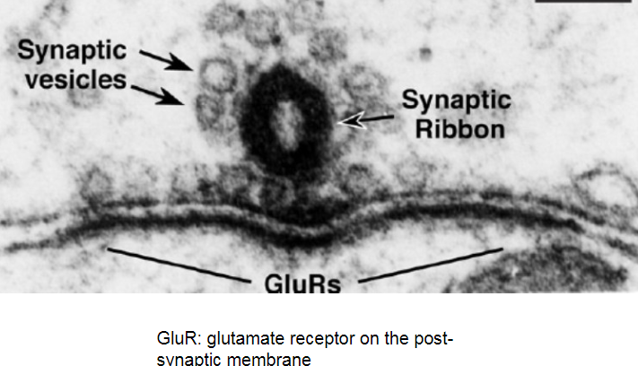 Specific to the auditory system; They facilitate the release of neurotransmitters by holding the vesicles close to the active zone. (Pre-synaptic regions have these ‘ribbons’)