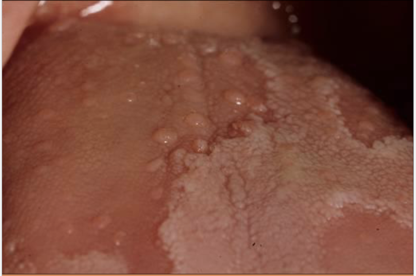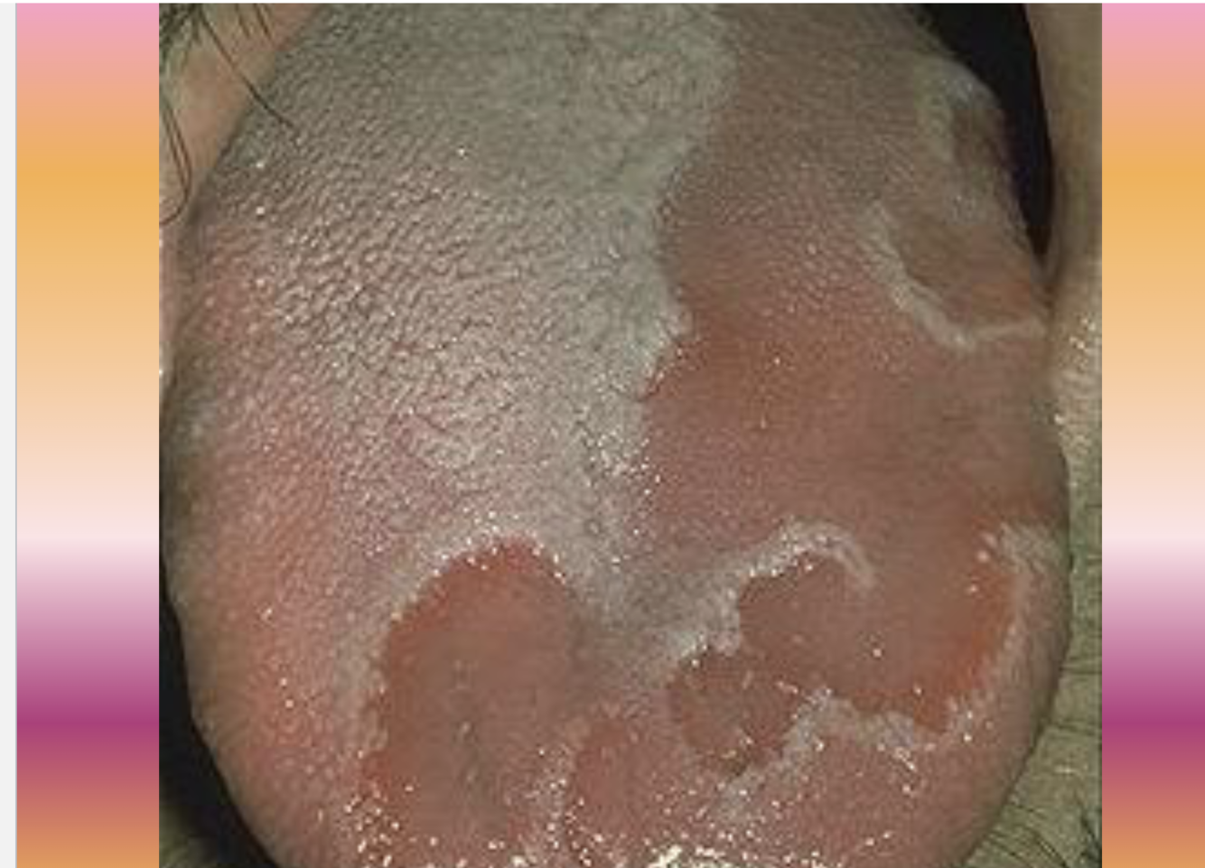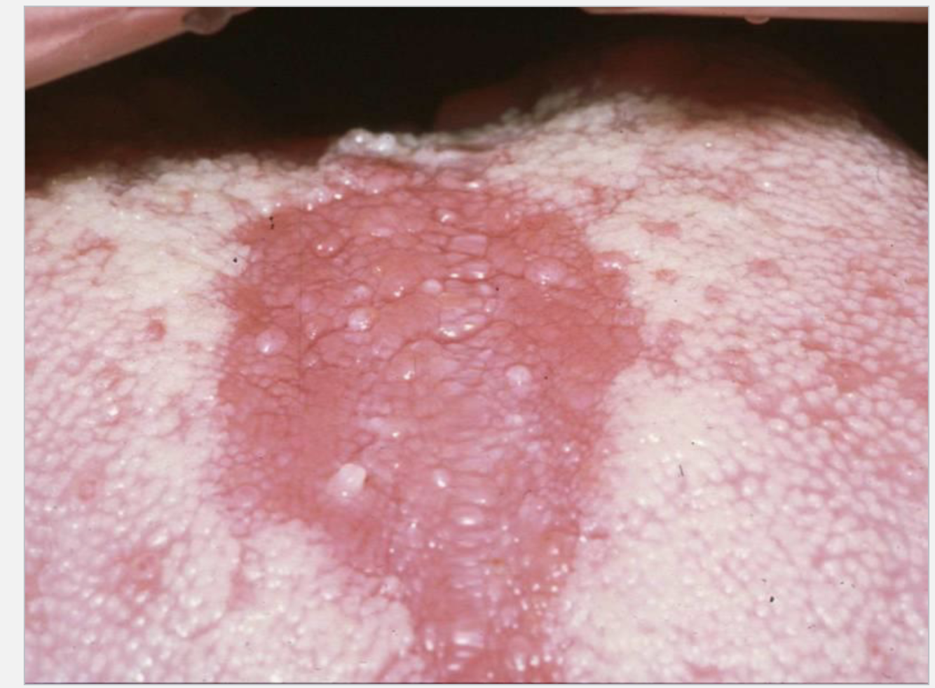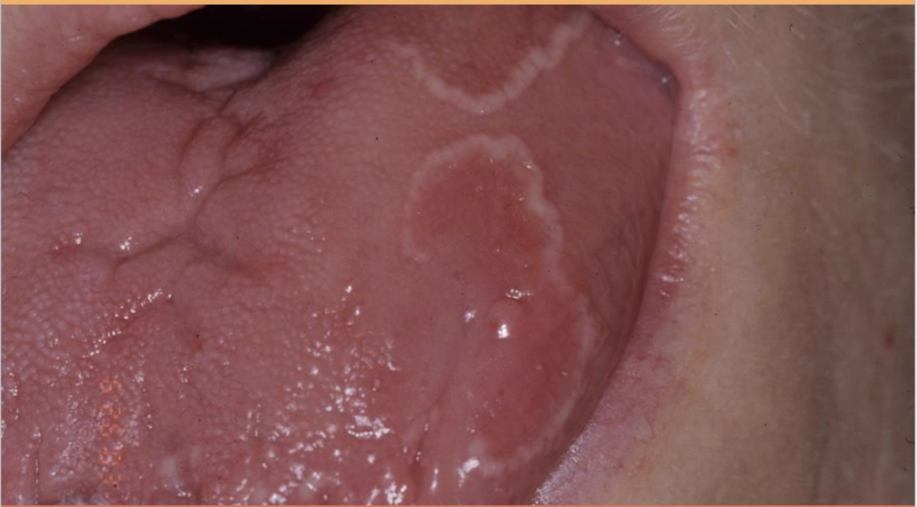 • Cause unknown – Hypersensitivity to environmental factor ? • Common at tip and lateral border • Red – Multiple erythematous zones – Atrophy of filliform papillae • White • Elevated, yellow-white, serpiginous border