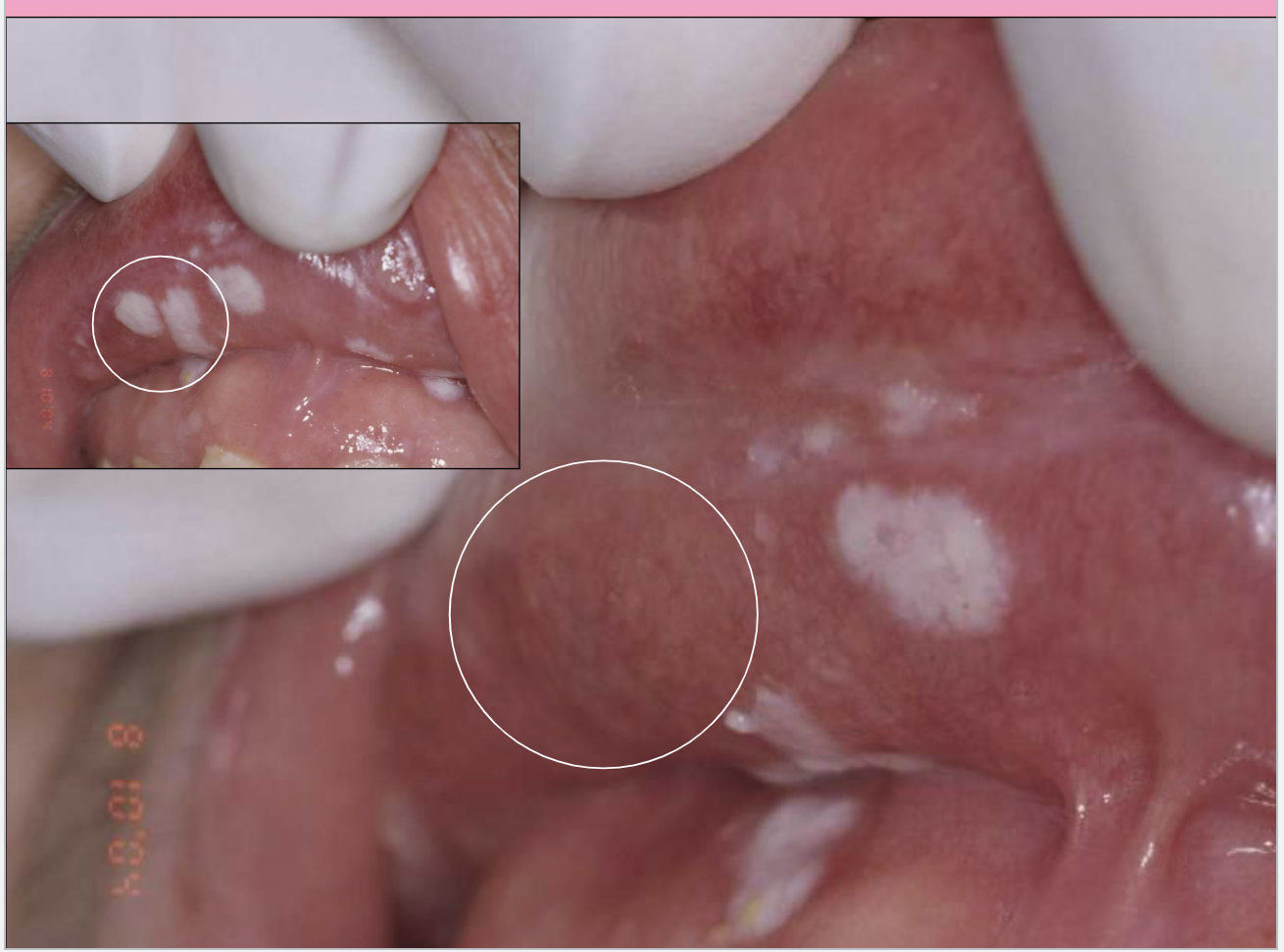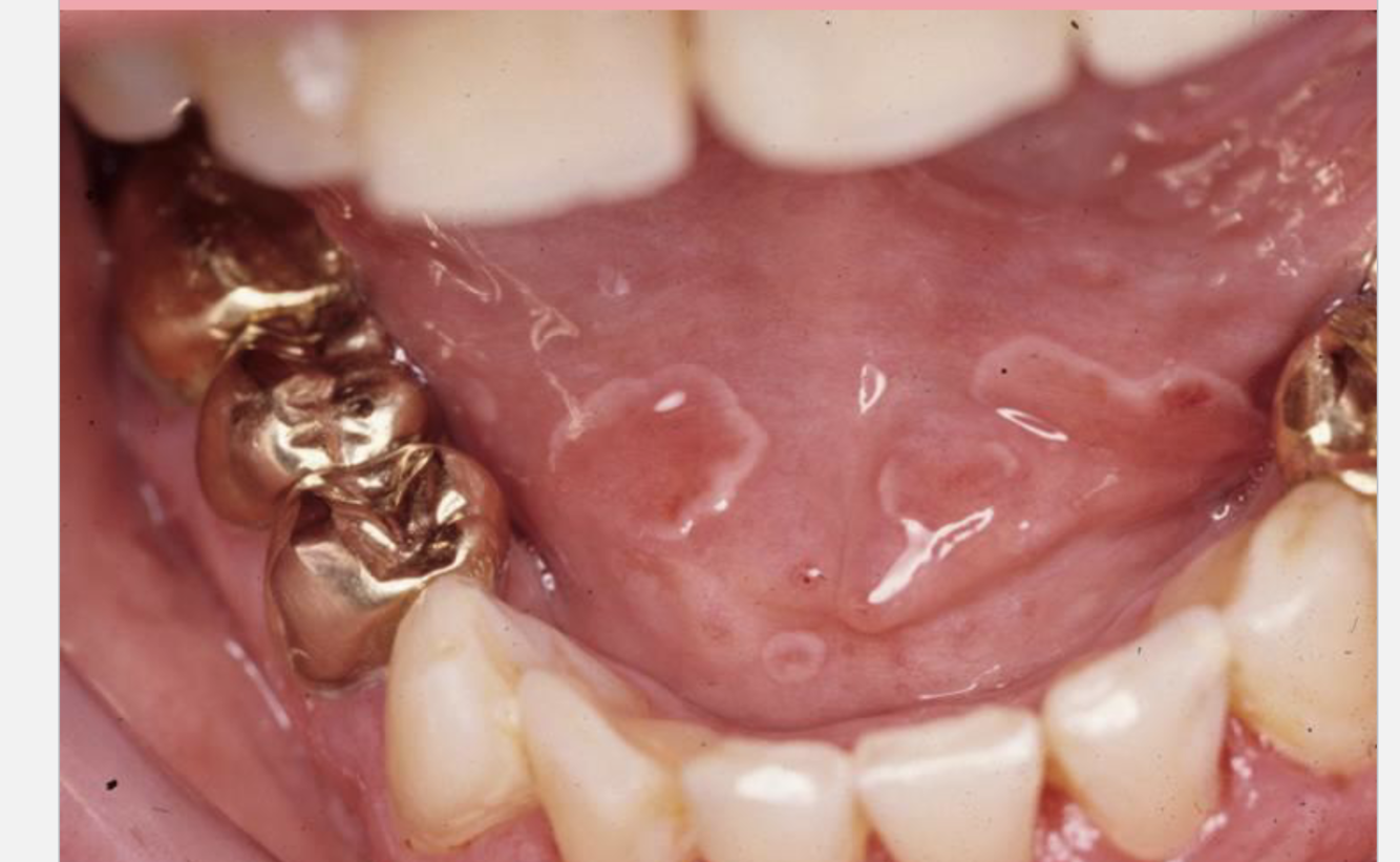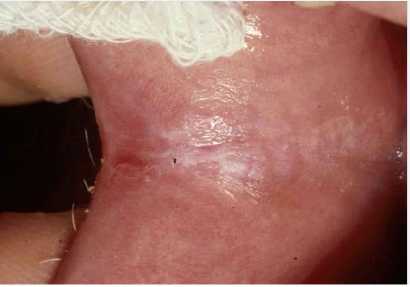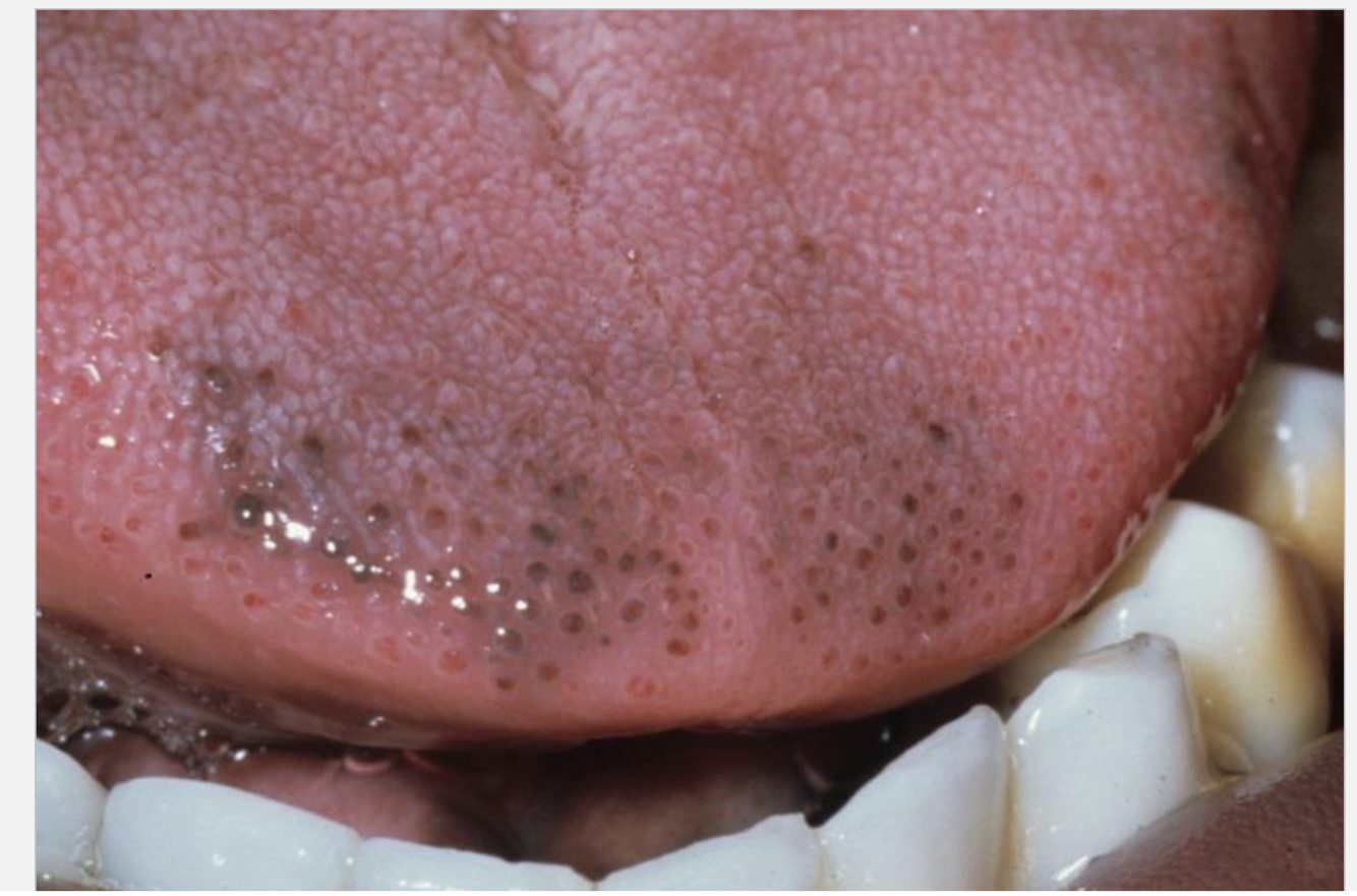 • Cause unknown – Hypersensitivity to environmental factor ? • Common at tip and lateral border • Red – Multiple erythematous zones – Atrophy of filliform papillae • White • Elevated, yellow-white, serpiginous border