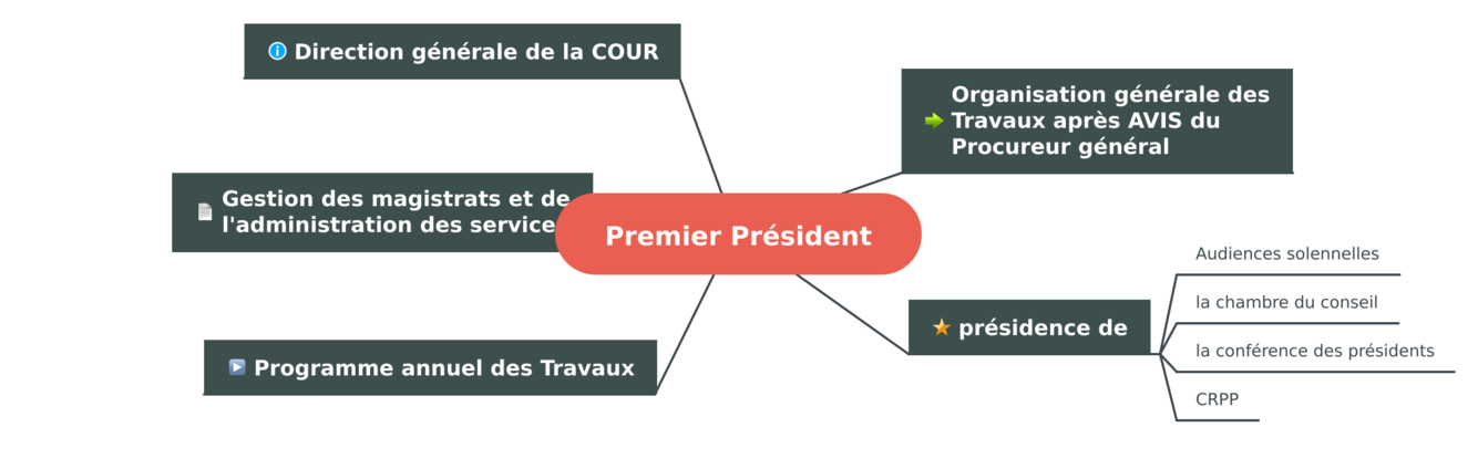 Avis : il rend un avis sur l’organisation générale, répartition des attributions, programme des travaux. Il requiert l’installation des magistrats en audience solennelle et le serment des vérificateurs et greffiers et des comptables (en Crc)